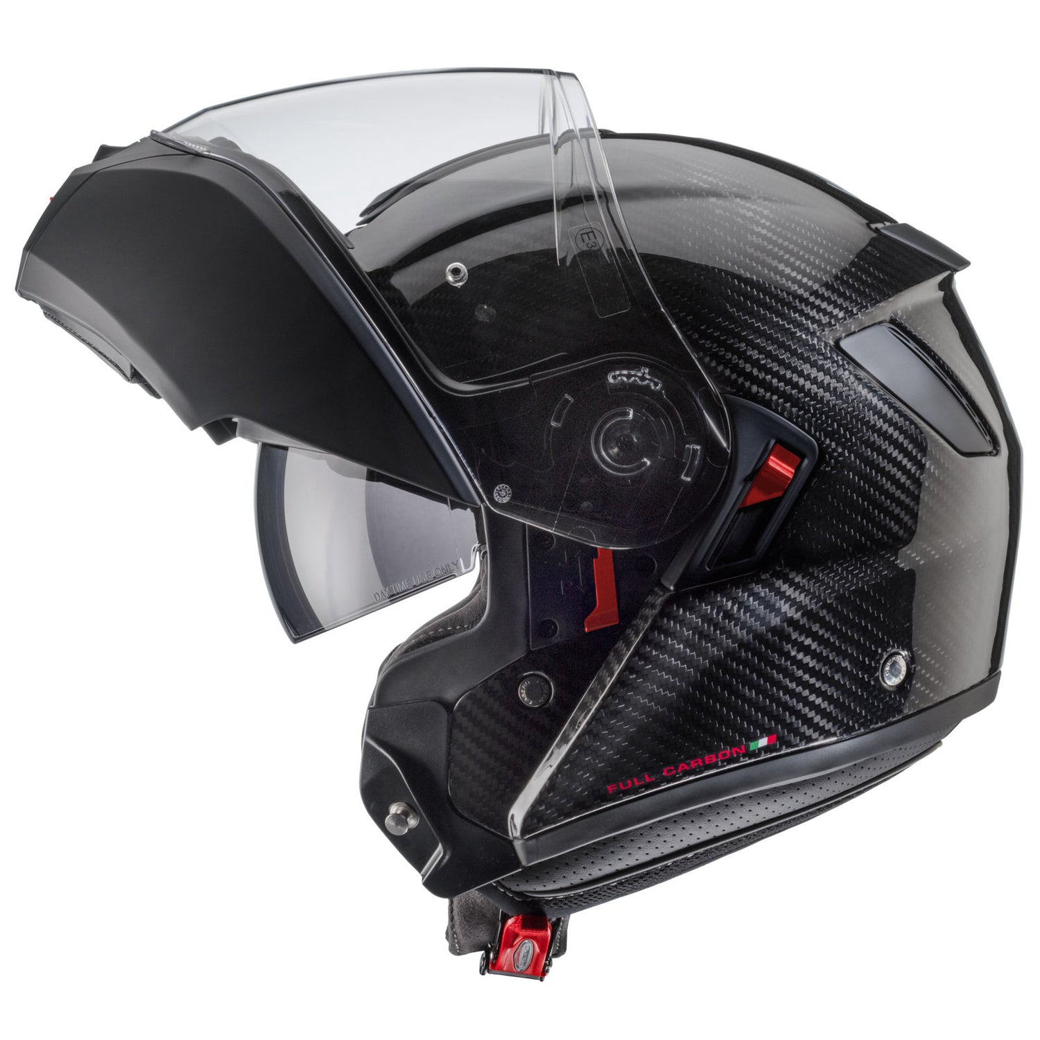 Der Caberg LEVO X Klapphelm verbindet moderne Technik mit hoher Funktionalität und ist für anspruchsvolle Motorradfahrer konzipiert. Die Außenschale besteht je nach Ausführung aus TRI-Composite-Material (Fiberglas, Carbon, Kevlar) oder aus vollständig Carbonfaser. Zwei Schalengrößen sorgen für ein ausgewogenes Verhältnis zwischen Schalenvolumen und Kopfgröße.